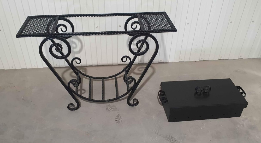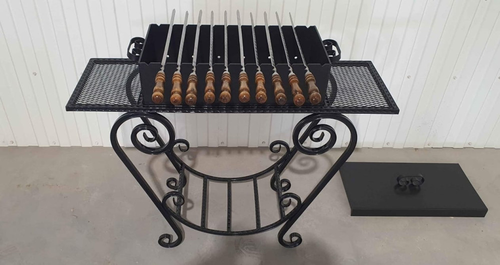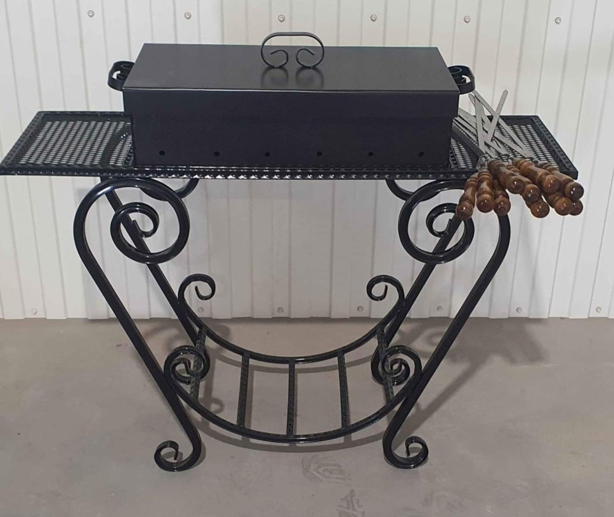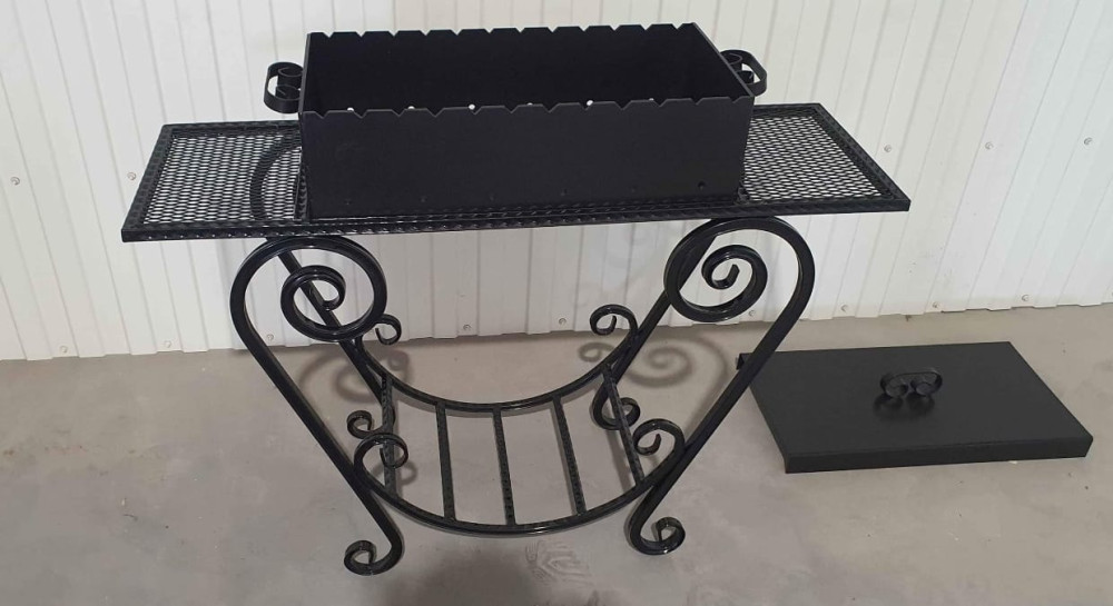 Klasiska izskata grils ar malkas vietu. Izturīgs grils ar plauktiem un noņemamu mangalu. Vāks komplektā.