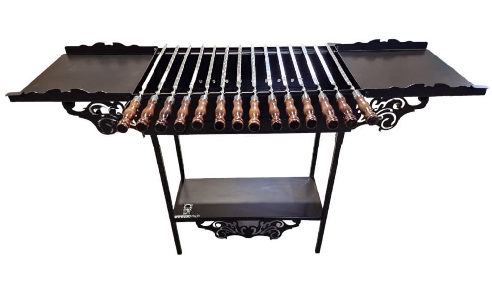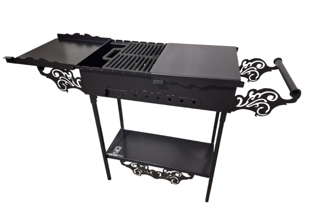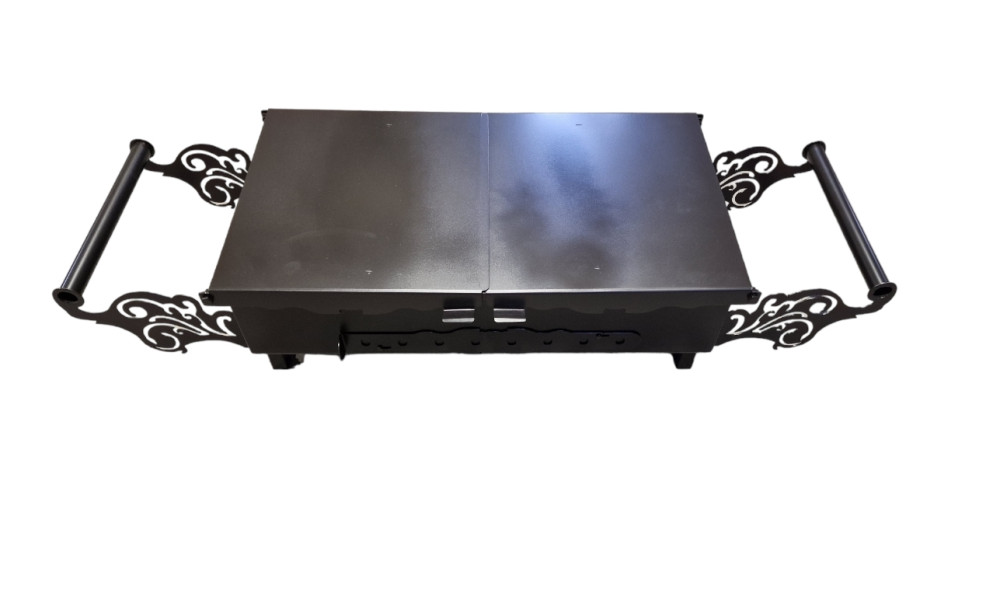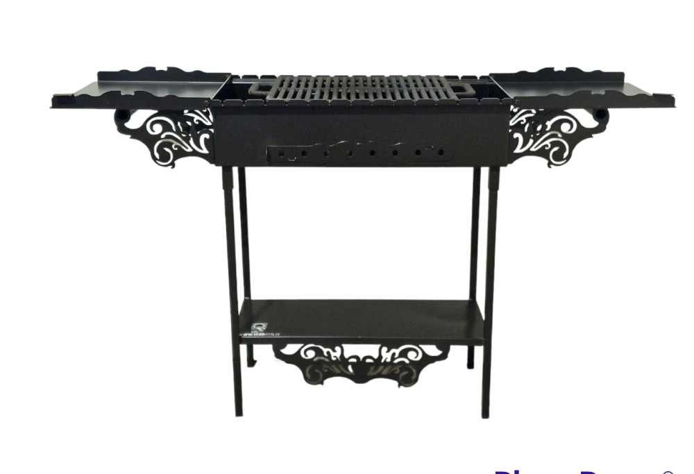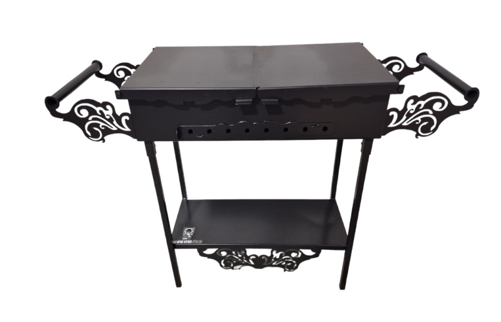 Liels izjaucāms grils ar vāku un galdiņiem.