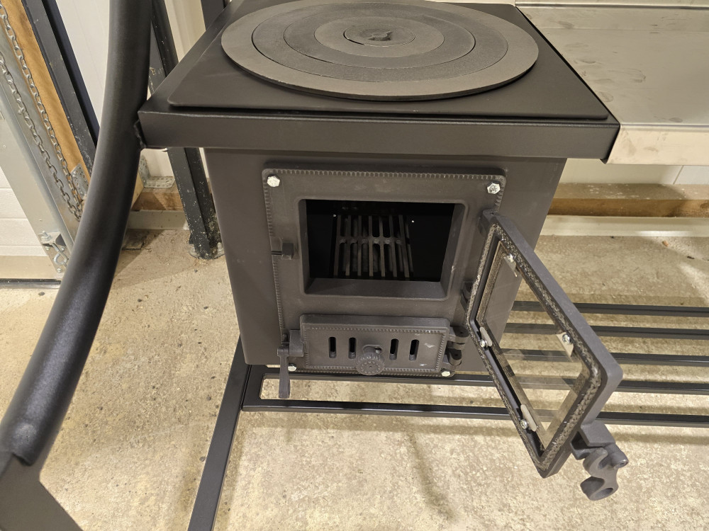 Krāsns ar čuguna durvīm un termoiztūrīgu stiklu.