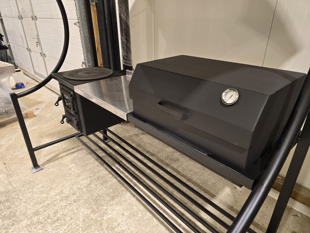 Liels grils ar nojumi un galdiņu no nerūsējoša tērauda.