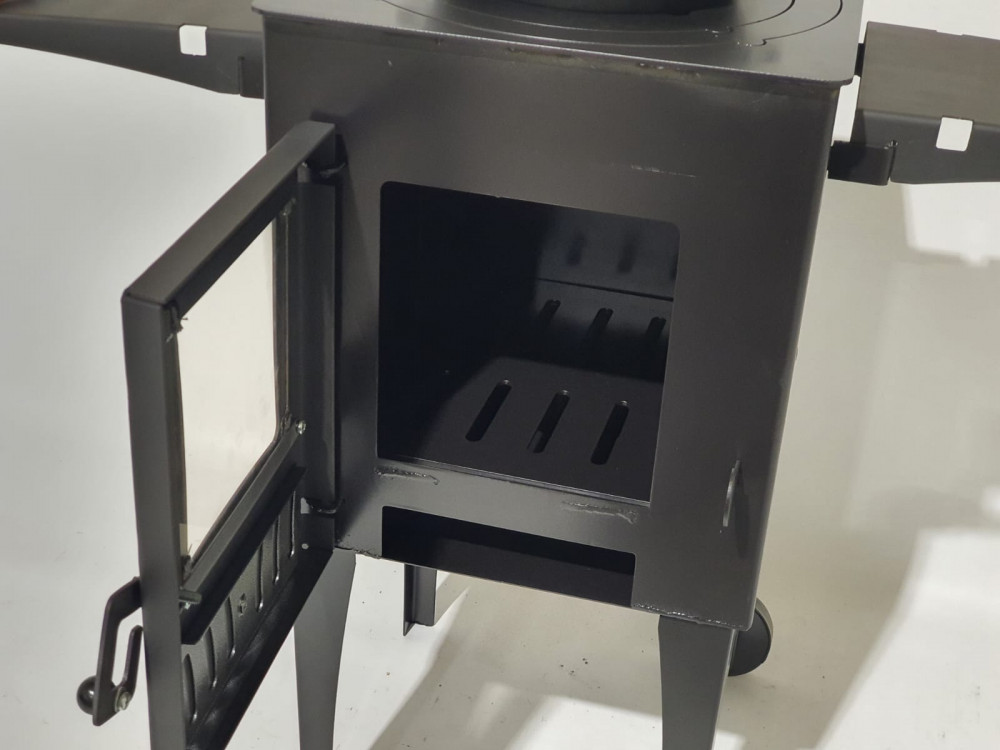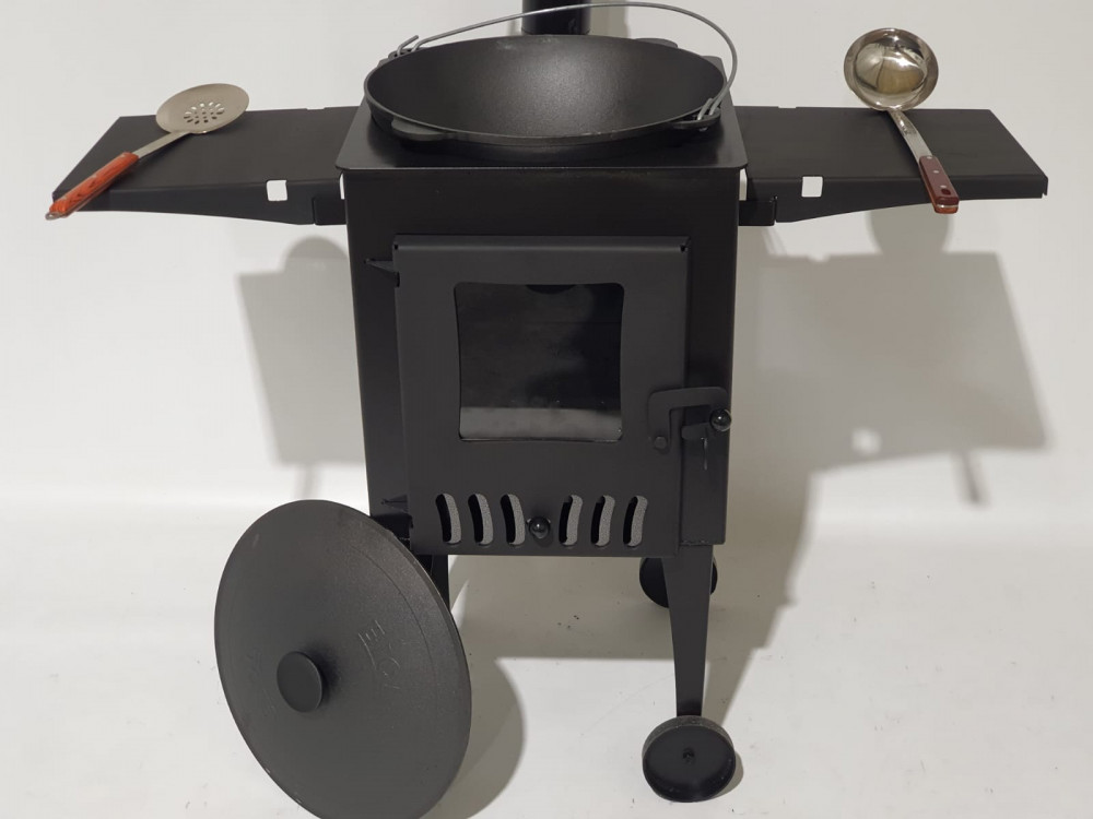 Komplektā durvtiņas ar karstumizturīgo kamīna stiklu, dažāda diametra metāla riņķi, noņemami plaukti, dūmvads un metāla riteņi ērtai pārvietošanai.