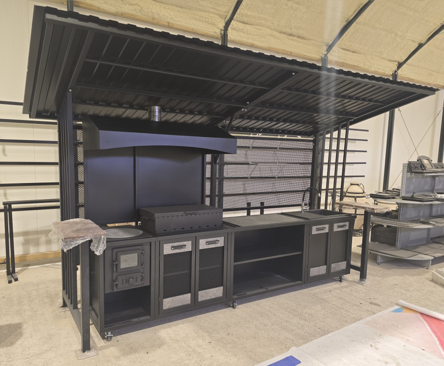 Кухня состоит из 4ех модулей - раковина, печка,мангал и полки. Порошковая покраска.