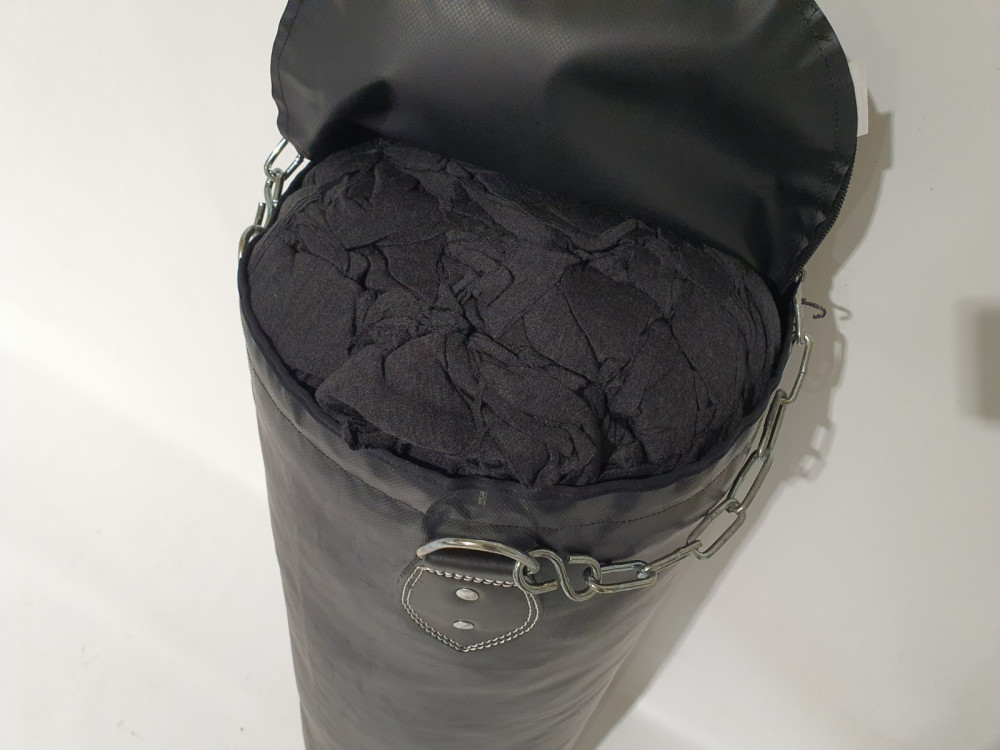 Boksa maiss ar auduma pildījumu. Boksa maisa materiāls - vinils. Ar ķēdēm.