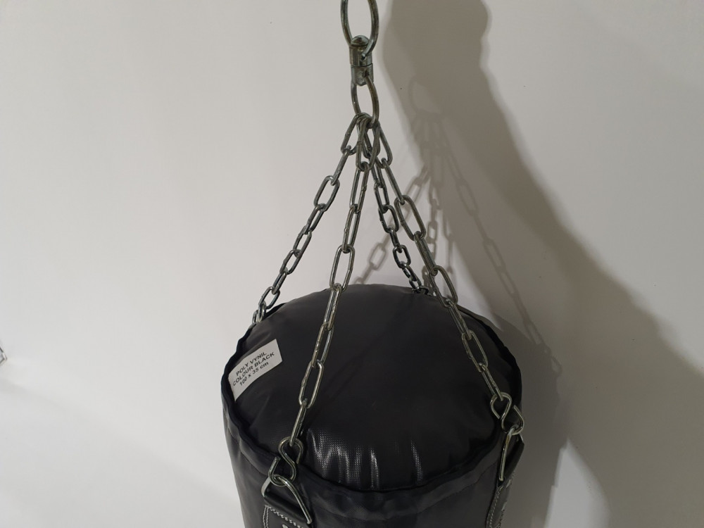 Boksa maiss ar auduma pildījumu. Boksa maisa materiāls - vinils. Ar ķēdēm.