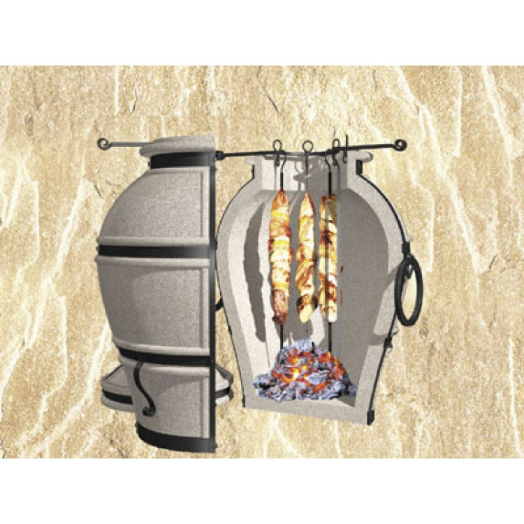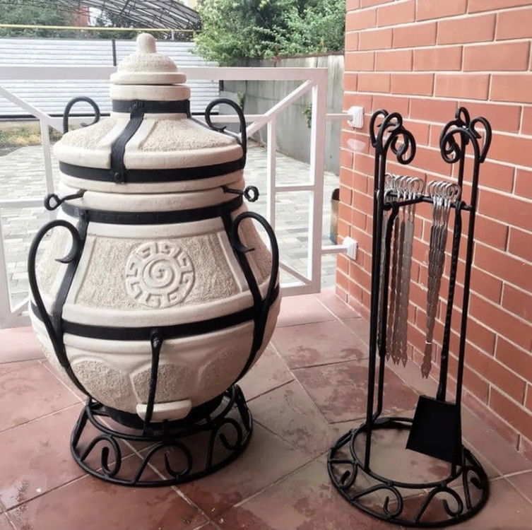 Komplektācija : kruķis, lapstiņa, kurtuves reste D19, iesmu piekaršanas ierīce, 12 iesmi (darba virsma 34cm, kopējais garums 43cm), metāla paliktnis tandiram, metāla paliktnis tandira piederumiem.