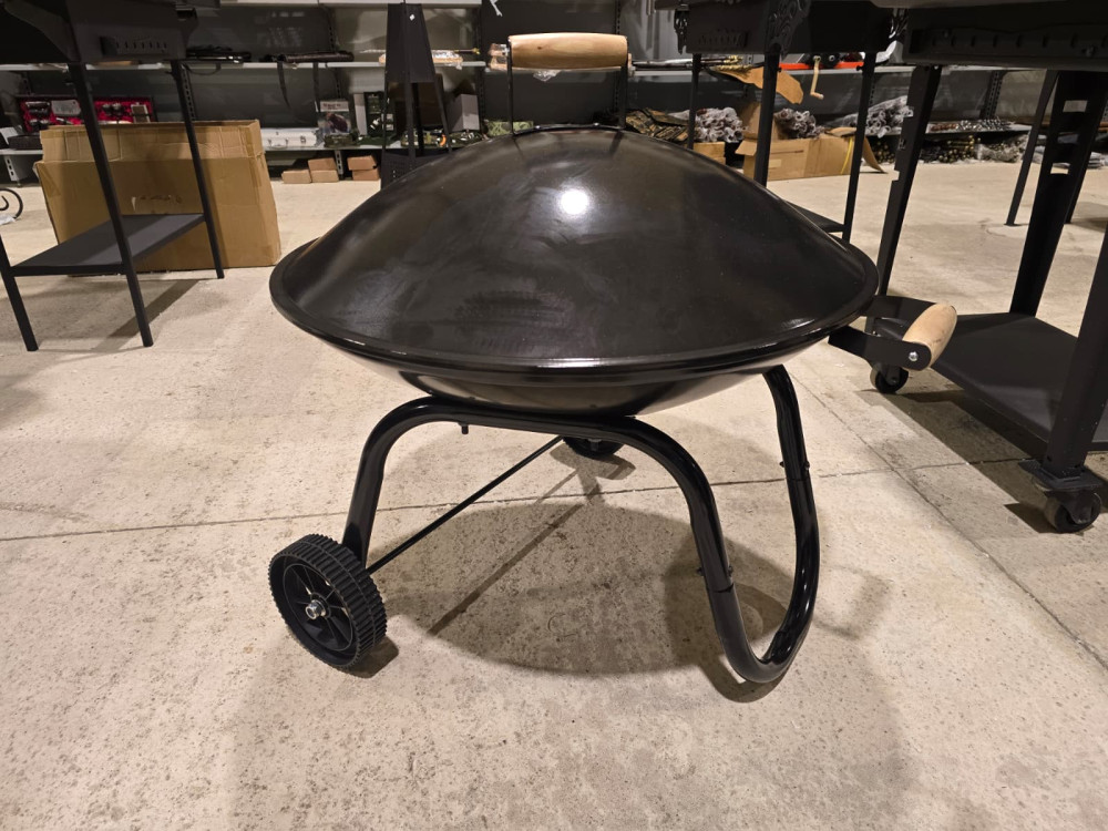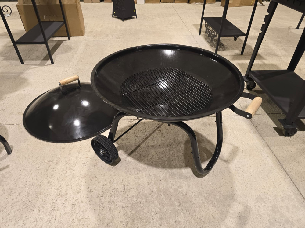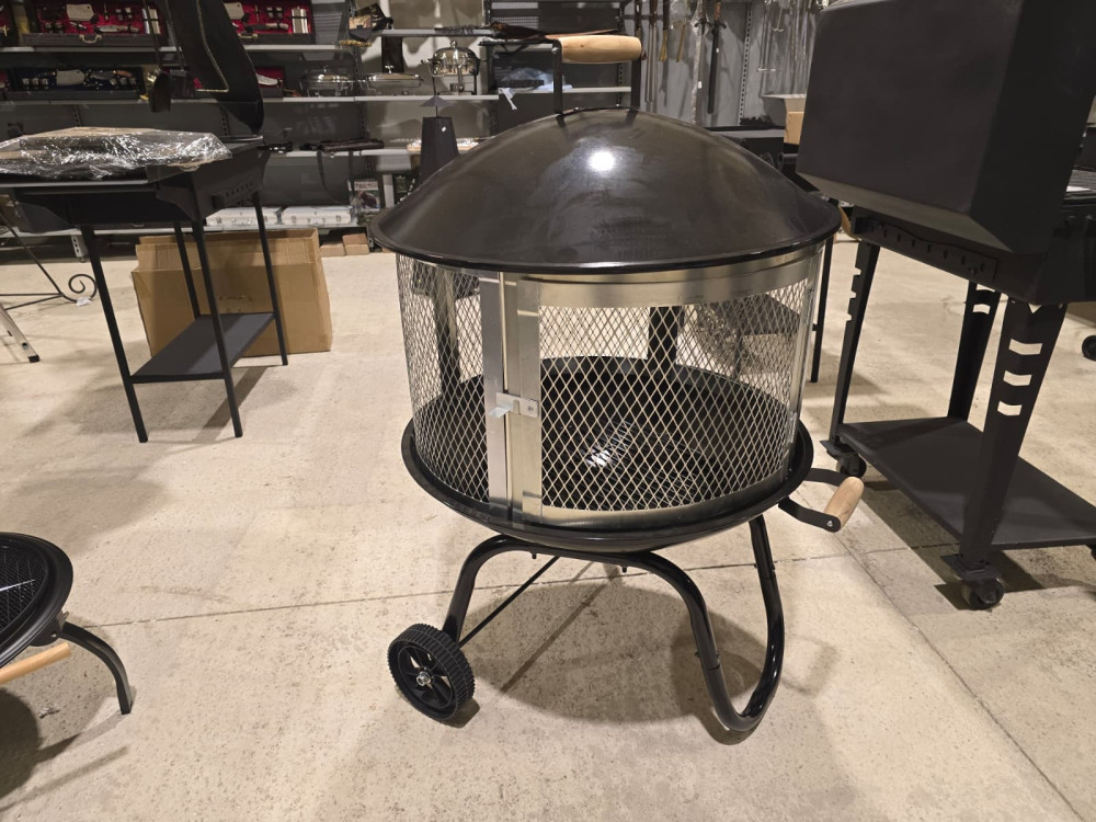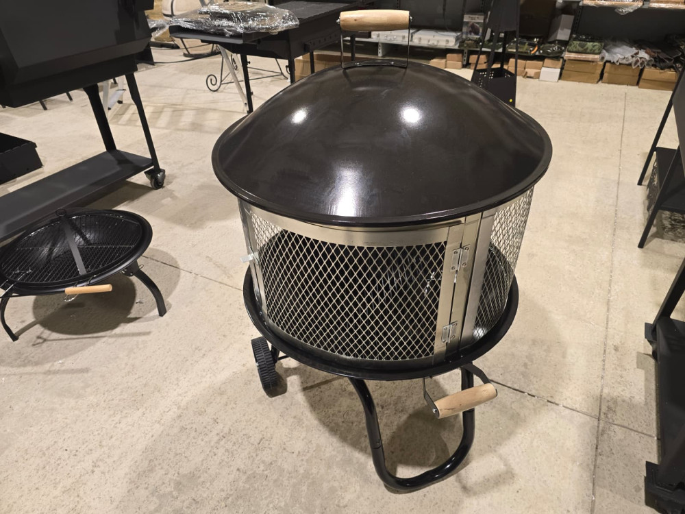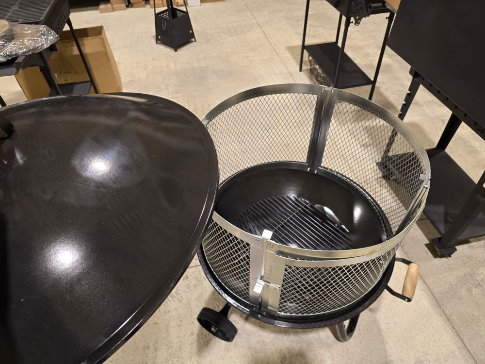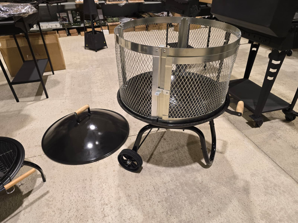 Apaļa ugunskura vieta ar sietu un vāku, ērta lapu dedzināšanai. Ir rokturis un riteņi ērtai pārvietošanai.