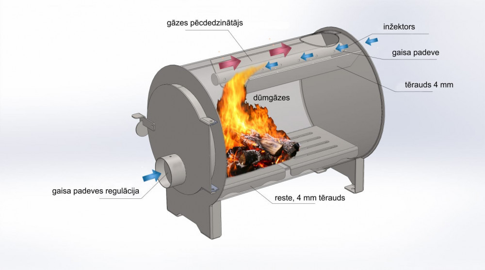 Pirmā kamera ir aprīkota ar restēm, uz kurām tiek sadedzināts cietais kurināmais. Izdalītās krāsns pirolīzes gāzes uzkrājas sekundārajā kamerā. To pēcsadedzināšanas laikā izdalās papildu siltuma daļa, kas ļauj efektīvāk izmantot kurināmo un samazināt apkures izmaksas par 10-15%.