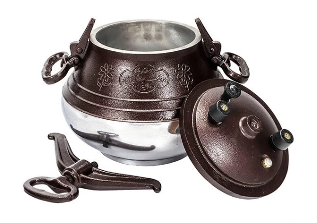 Afgāņu kazans 12l - ar rokturi, DIVKRĀSAINS. Izmanto ēdiemu pagatavošanai gāzes un elektriskajām plītīm, atklātā ugunī - krasnim, griliem. Ir drošības vārsts un vārsts tvaika izlaišanai. Var piepildīt ne vairāk kā 2/3 no apjoma.